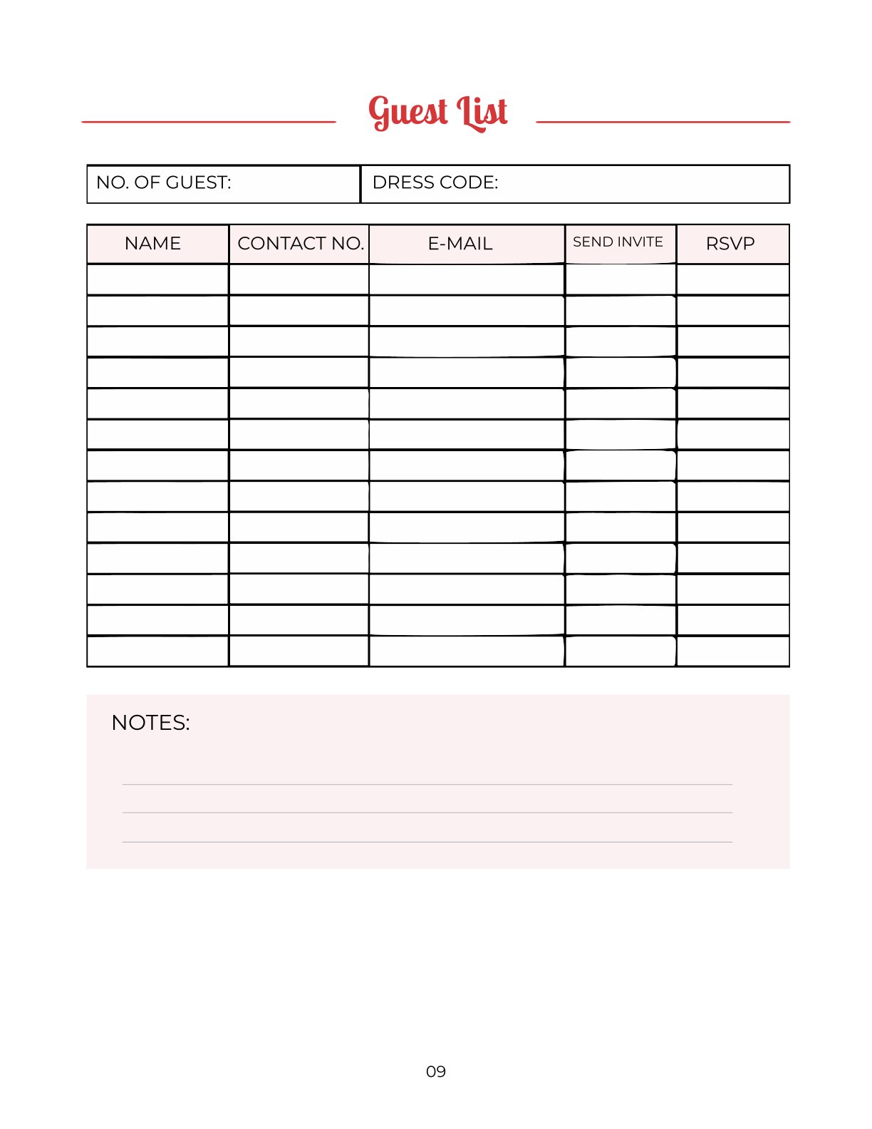Page 9 — Guest List: name, contact, email, send invite, RSVP, plus dress code & guest count.