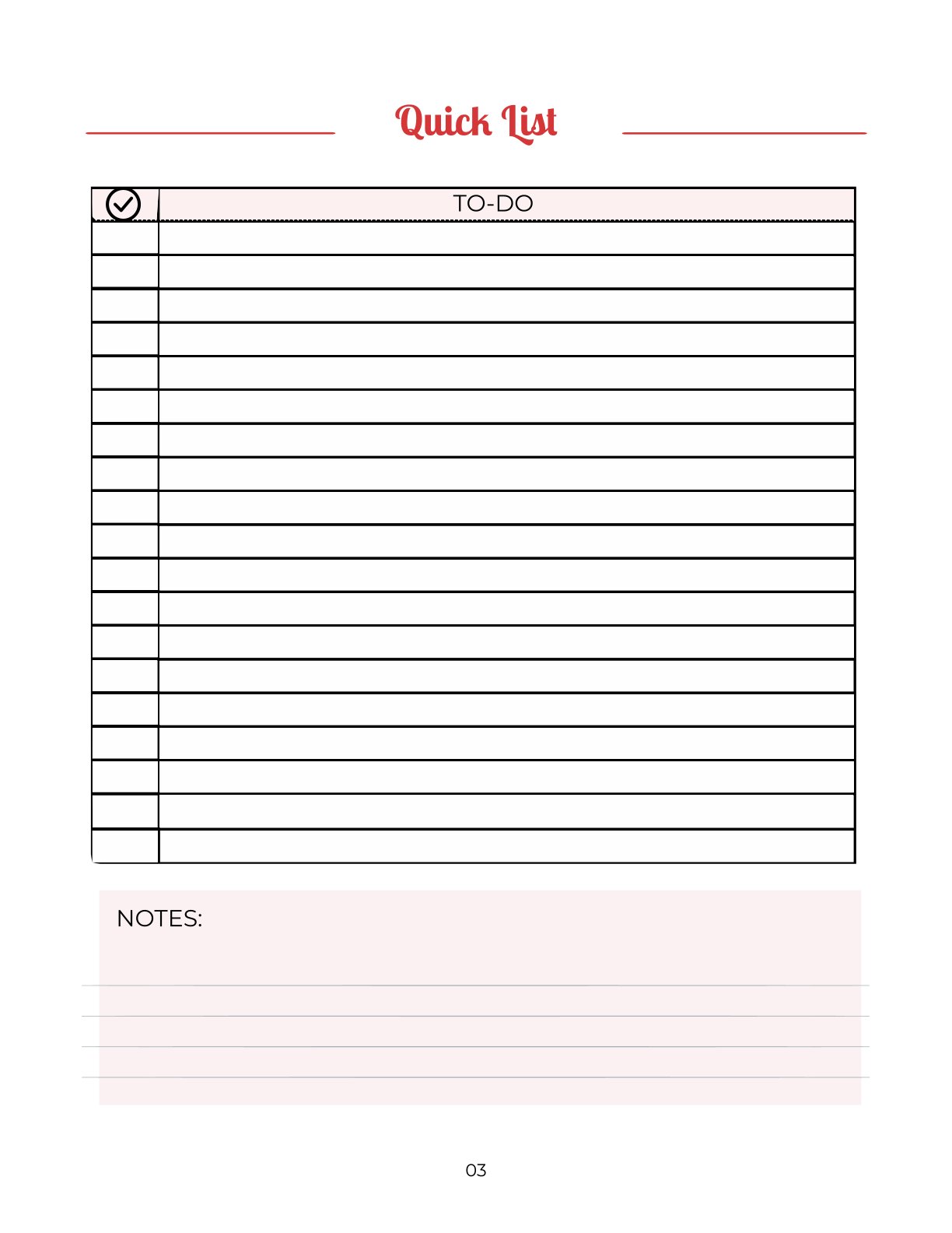 Page 3 — Quick List (to-do) with notes for week-of and day-of tasks.