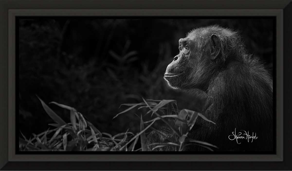 - Notes from the Artist: It has been said that “the eyes are the windows to the soul,” and I have found this to be true. Not only in people, but also in animals – most especially in the great apes. “The Thinker” is part of my “Almost Human” series that explores the expressions of these magnificent creatures, looking for the souls in our most closely-related counterparts. Chimpanzees, gorillas, bonobos, and orangutans are so much like us that if you spend time with them, you can almost tell what they are feeling. Some are young and playful, some are old and wise, and some are shy and do not want to be bothered. I want to show the heart of these beautiful animals so more people can find a deeper understanding and affection for them, and learn more about the conservation efforts to help them. What a better world it would be for man and apes alike.