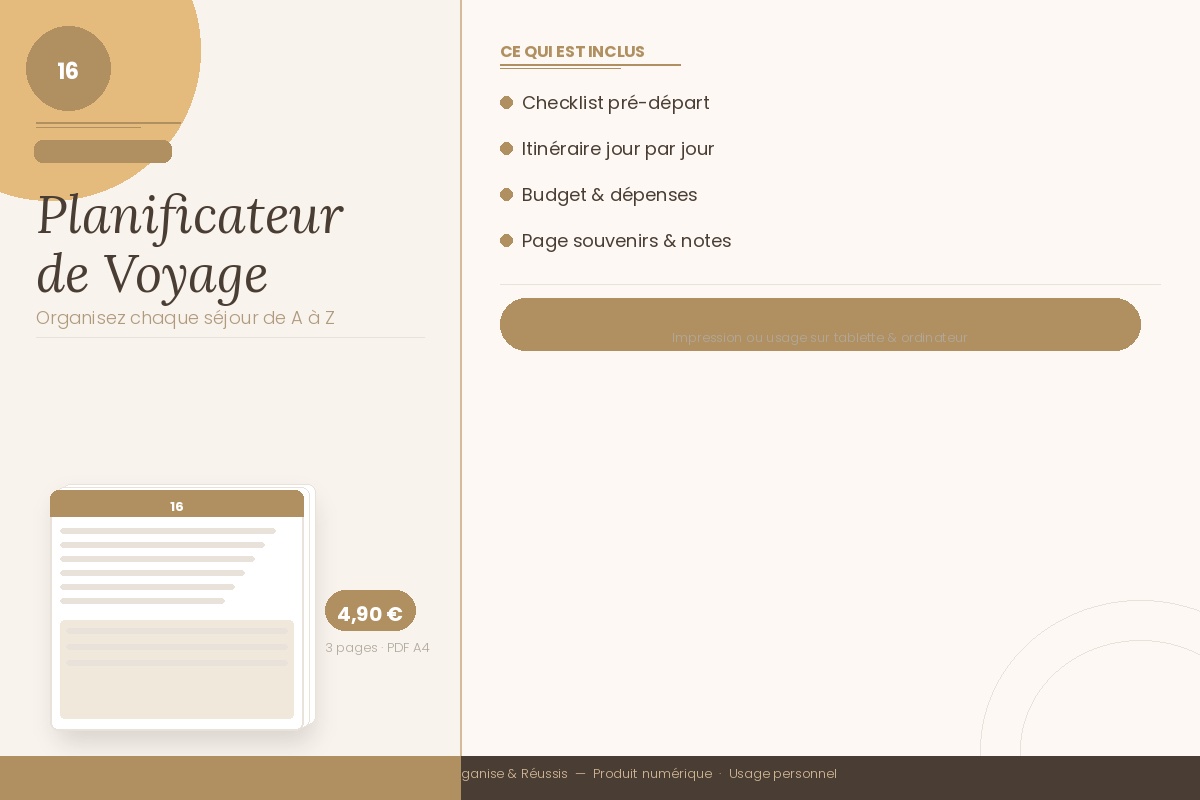 ✦ Pour qui : Voyageurs souhaitant organiser chaque séjour avec méthode et garder une trace de leurs aventures.