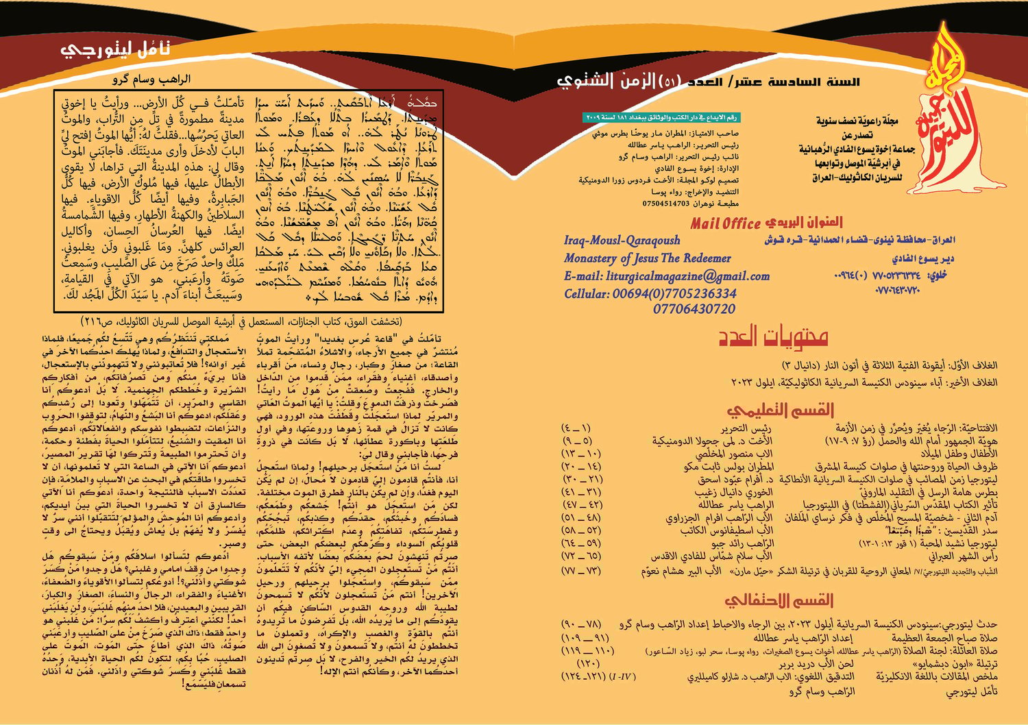 نَزفُّ إليكُم العَدد الجديد من المجلة الليتورجيّة، العدد 51 من السنة 16 من عمر المجلة في الزمن الشتوي من السنة الليتورجية. خُصوصيّة هذا العدد تَتمثّل فيما أطلَق عليه دكتور أفرام عبّود "ليتورجيا زمن المصائب"، وهو طرح يحاول سَبر صَلواتنا الليتورجيّة السّريانيّة الانطاكيّة وكيف تَعاملت مع الكوارث الطبيعيّة والمصائب الاجتماعيّة والاضطهادات، وقد جاراه المطران بولس ثابت في تقديم ذلك في صلوات كنيسة المشرق. بالإضافة إلى مَقالات أُخرى مُتنوّعة. ويَستعرض الحدث الليتورجي سينودس الكنيسة السريانيّة الكاثوليكيّة في ايلول 2023، الذي أُقيم في بغديدا، لأول مرّة في تاريخ الكنيسة. بالإضافة إلى القسم الاحتفالي الذي يُقدِّم لأوّل مرّة صلاة صباح الجمعة العَظيمة، ونُكمل صلاة العائلة مع موضوع الرجاء في سفر حزقيال النبي. الرّجاء هو فعلا موضوع هذا العدد وهذا ما تُقدّمه افتتاحية هذا العدد والتي تستطيعون قراءتها في الصورة المدرجة مع هذا المنشور.
