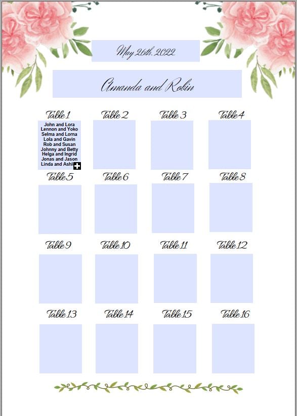 3. file - 1 file size A2 (16.5 x 23.4 inches) Editable table seat planner to organize seating and you can print out and hang up at the reception. You can edit the Date, names of the bride and groom, and guests at each table. There is space for 9 lines of guests at each table. 16 tables all in all.