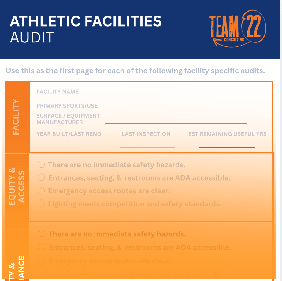 This s a structured audit and long-term capital planning tool for school athletic facilities. Its purpose is to help districts systematically evaluate facility safety, compliance, equity, and condition, then translate those findings into a clear 5–10 year capital plan that prioritizes projects before failures occur. It is designed to move facility discussions from reactive repairs to proactive, strategic decision-making.