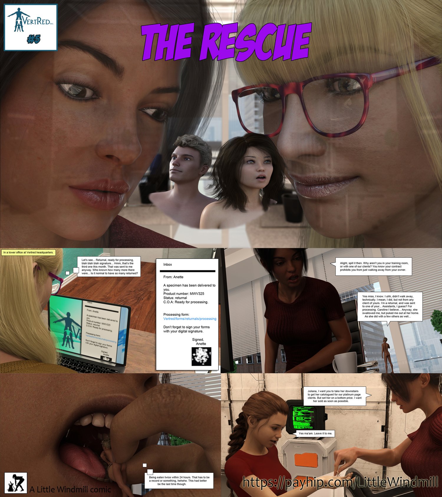 In the 5th comic in the Vertred series, we see the intern/trainee Caroline (From Vertred #3) secretly rescuing shrunken specimen. But one of the tinies happens to be a willing volunteer, and wants what he signed up for, getting everyone else into trouble...