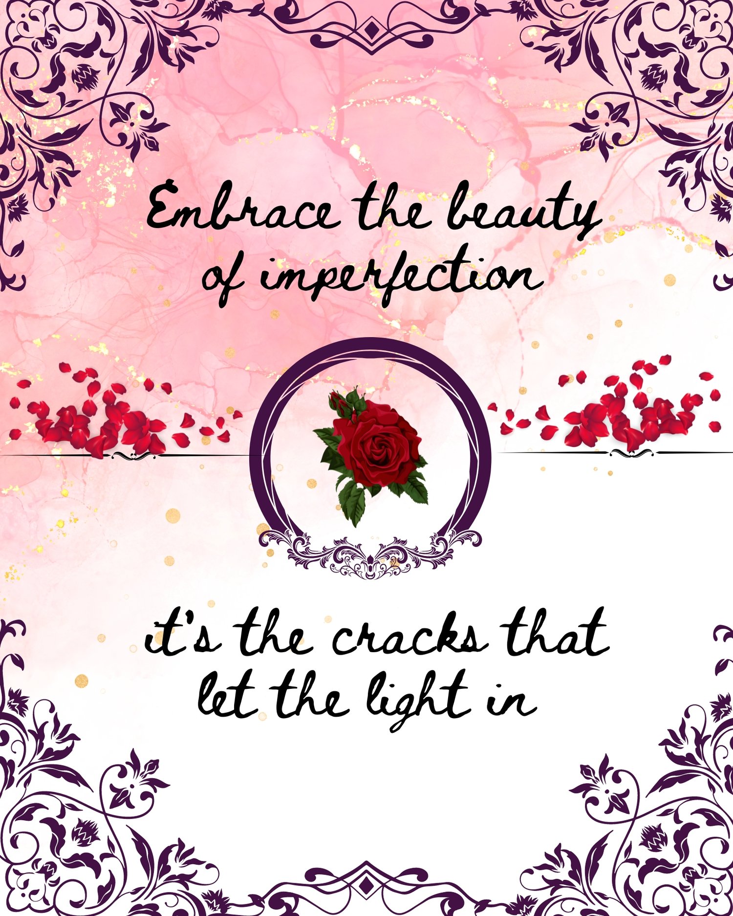 Quote emphasizes the idea that imperfections are not flaws to be hidden or ashamed of, but rather sources of beauty and strength. It suggests that through embracing our imperfections, represented metaphorically as "cracks," we allow light, symbolizing positivity and growth, to enter our lives and illuminate our experiences.