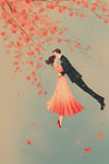- A couple is depicted kissing under a cherry blossom tree. The man is angled as if leaning in for a kiss, with the woman in a flowing dress.