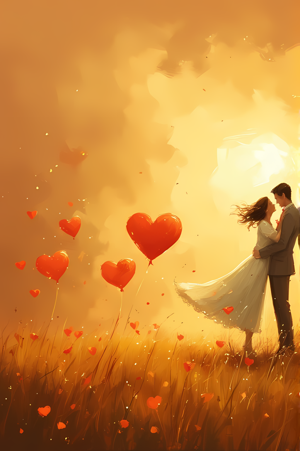 - The image depicts a couple embracing in a field of grass with heart-shaped balloons. The scene is bathed in a warm, golden light.