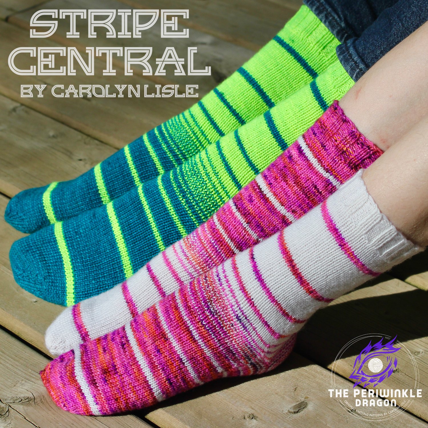 The Stripe Central Socks are a fun and easy way to jazz up an otherwise-vanilla pair of socks! Not interested in working a boring, repetitive striping pattern on your two-colour knitted socks? Well, these socks use Fibonacci numbers to keep your attention throughout the project… and to help you produce something that’s just that one extra step beyond a typical striped sock!