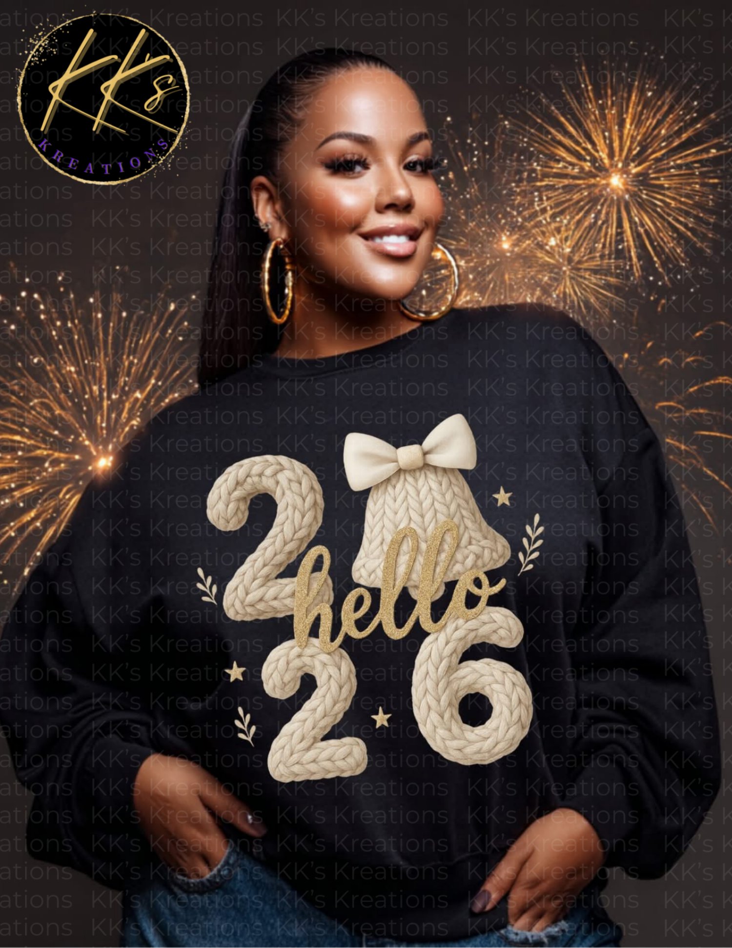 Step into the New Year looking put-together and comfortable. This “Hello 2026” sweatshirt features a cozy knit-inspired design with soft neutral tones, elegant gold accents, and a sweet bow detail that adds just the right amount of festive flair. It’s giving celebration, confidence, and effortless style all in one.