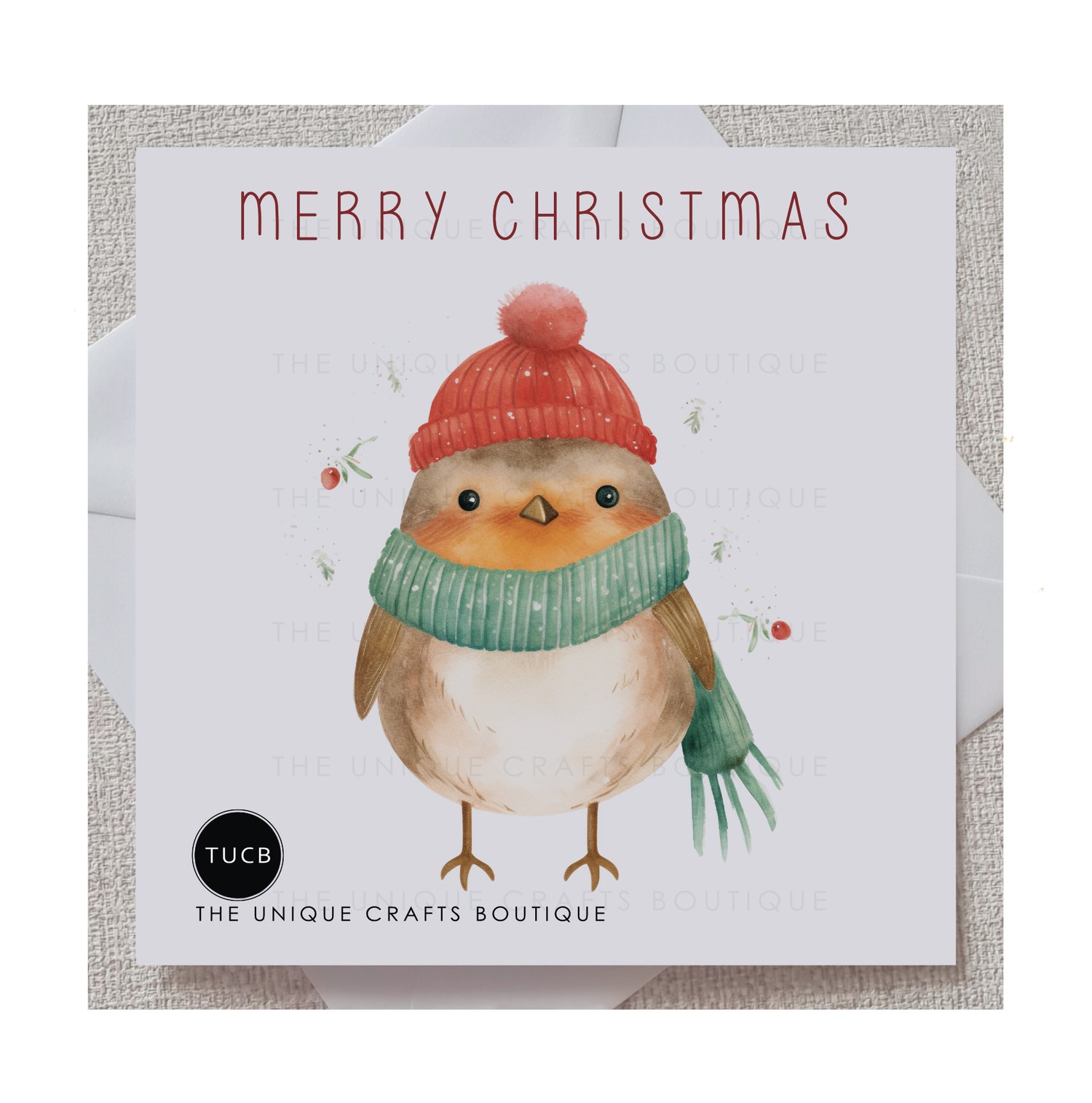 A pack of Ten greetings cards printed with a cute hand-drawn Christmas Robin wrapped in a woolly hat and scarf and displaying the greeting 'Merry Christmas' above.