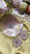 This elegant set includes a dish and two coasters, handcrafted from Italian epoxy resin. The soft lavender shade, combined with shimmering silver and holographic accents, creates an impression of refined sophistication. The crystal-like edges add texture and sparkle, turning each piece into a small work of art.