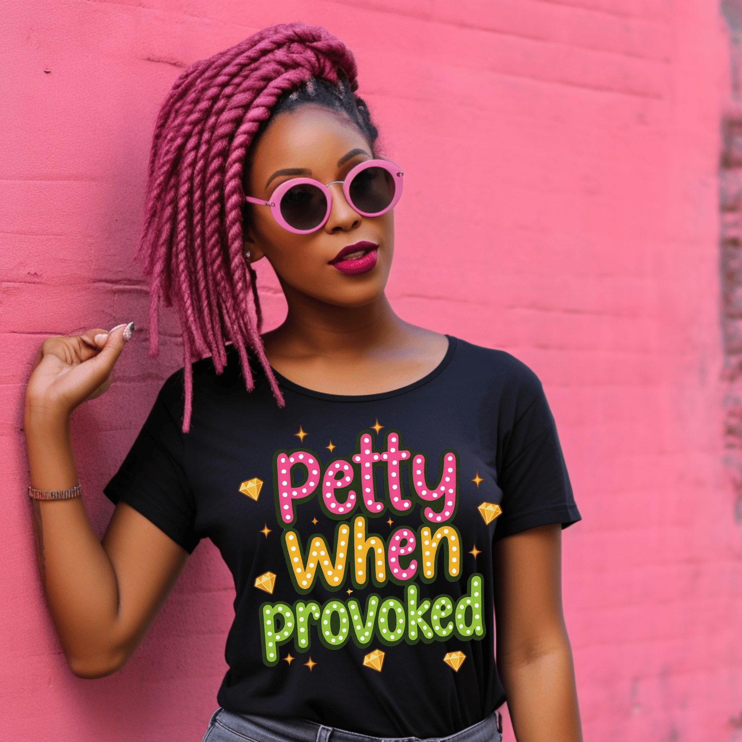 This bold and sassy “Petty When Provoked” design is perfect for those who keep it cute—until it’s time to clap back. With a playful glitter-style finish, this design adds sparkle to any shirt, tumbler, or bag. Perfect for sublimation projects that make a statement!