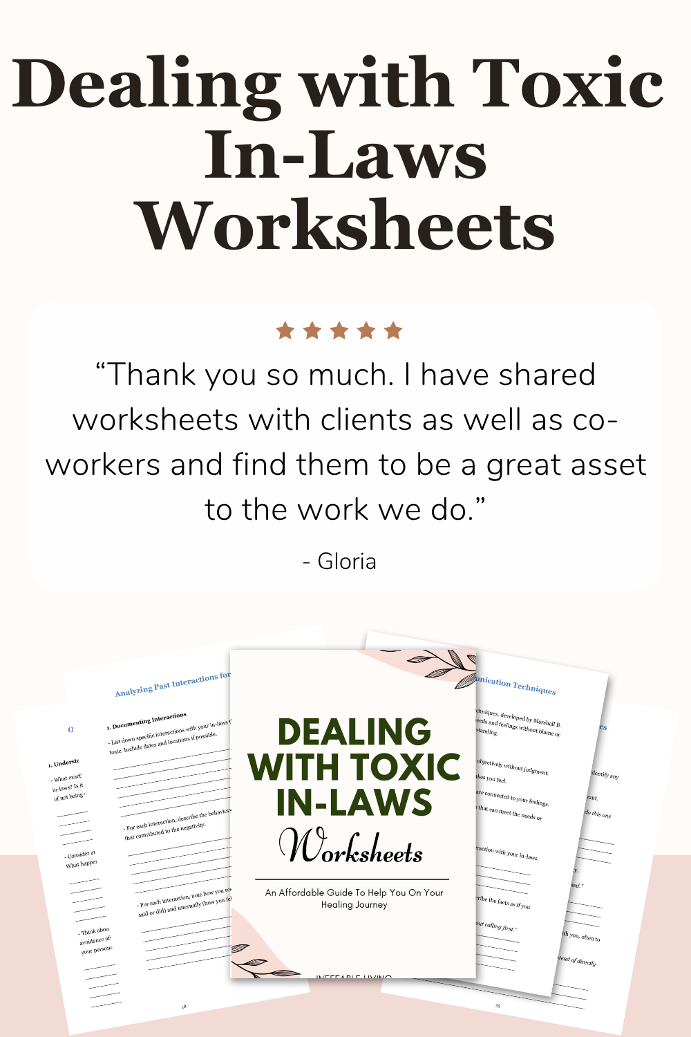 If so, Dealing with Toxic In-Laws Worksheets can help you navigate the turbulent waters of interacting with difficult in-laws and provide clarity, strategies for communication, and steps toward emotional well-being.