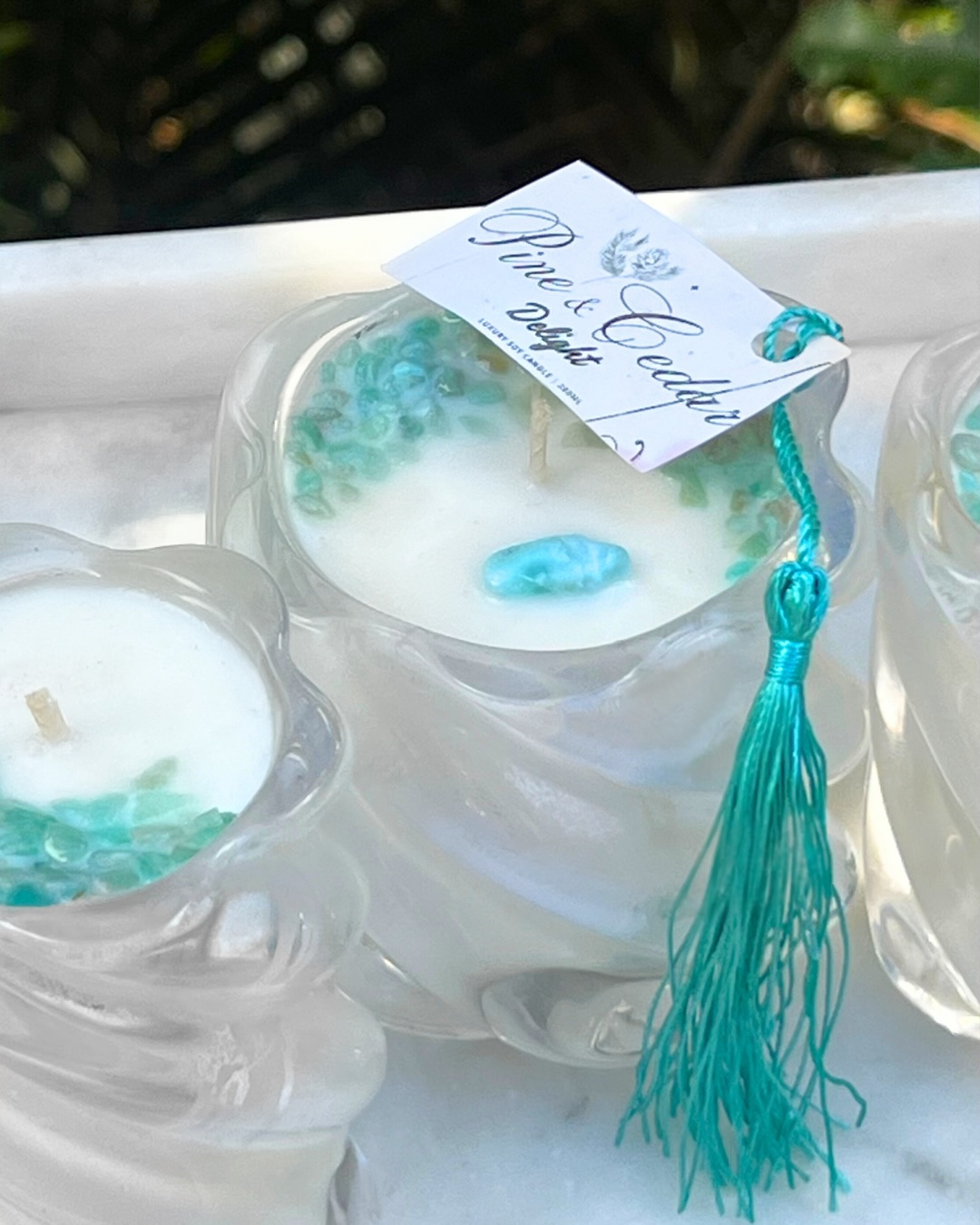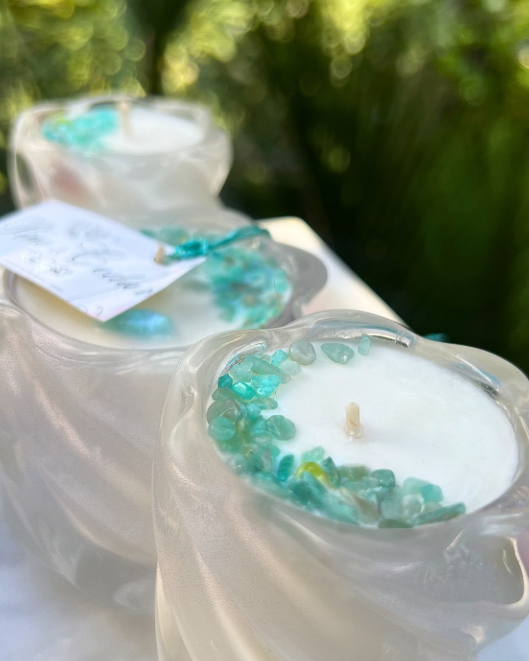 This unique candle is thoughtfully adorned with beautiful turquoise crystal pieces, known for their calming and protective properties. Turquoise has long been associated with peace, balance, and spiritual grounding, adding a meaningful touch to your space while enhancing your moments of self-care.