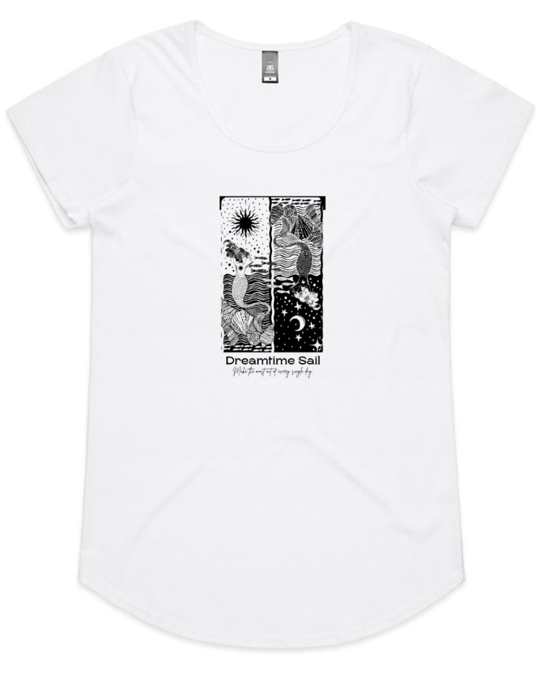 Effortless style meets all-day comfort in our Women’s Mali T-shirt. Designed with an extra-roomy fit and flattering scoop neckline, this lightweight tee moves easily from the beach to the bar. Featuring a bold full front ink print, choose from our iconic Dreamtime Sail logo or a range of fun, ocean-inspired designs—each created with women in mind. A beautiful wood block graphic of mermaids dancing night and day A playful image for the young at heart.