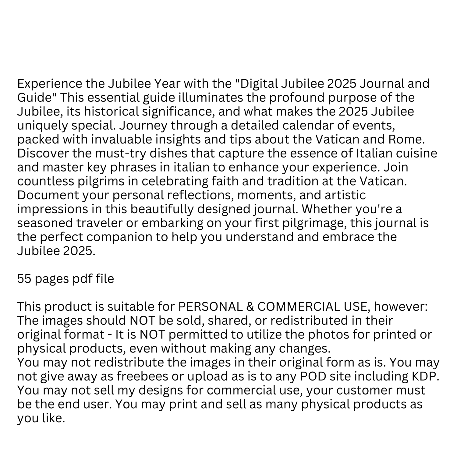Experience the Jubilee Year with the "Digital Jubilee 2025 Journal and Guide." This essential guide illuminates the profound purpose of the Jubilee, its historical significance, and what makes the 2025 Jubilee uniquely special. Journey through a detailed calendar of events, packed with invaluable insights and tips about the Vatican and Rome. Discover the must-try dishes that capture the essence of Italian cuisine and master key phrases in italian to enhance your experience. Join countless pilgrims in celebrating faith and tradition at the Vatican. Document your personal reflections, moments, and artistic impressions in this beautifully designed journal. Whether you're a seasoned traveler or embarking on your first pilgrimage, this journal is the perfect companion to help you understand and embrace the Jubilee 2025.