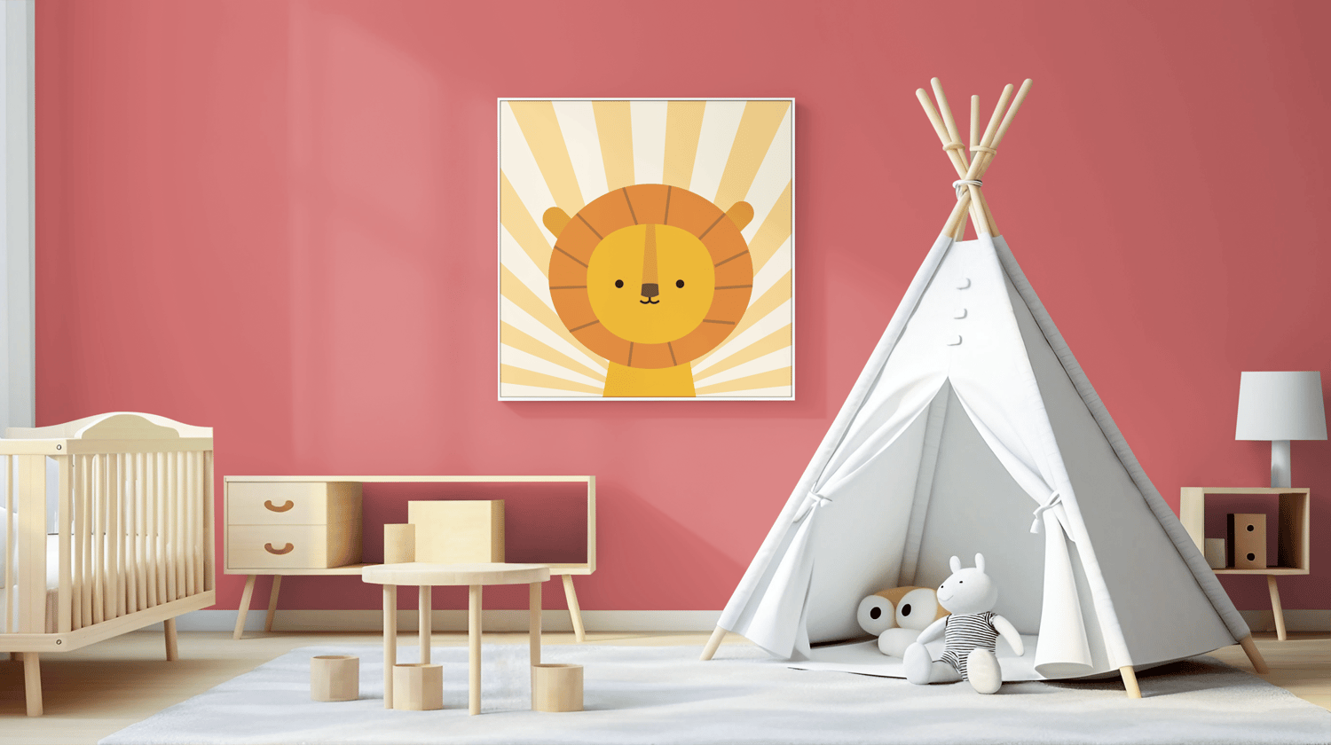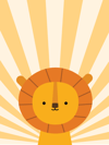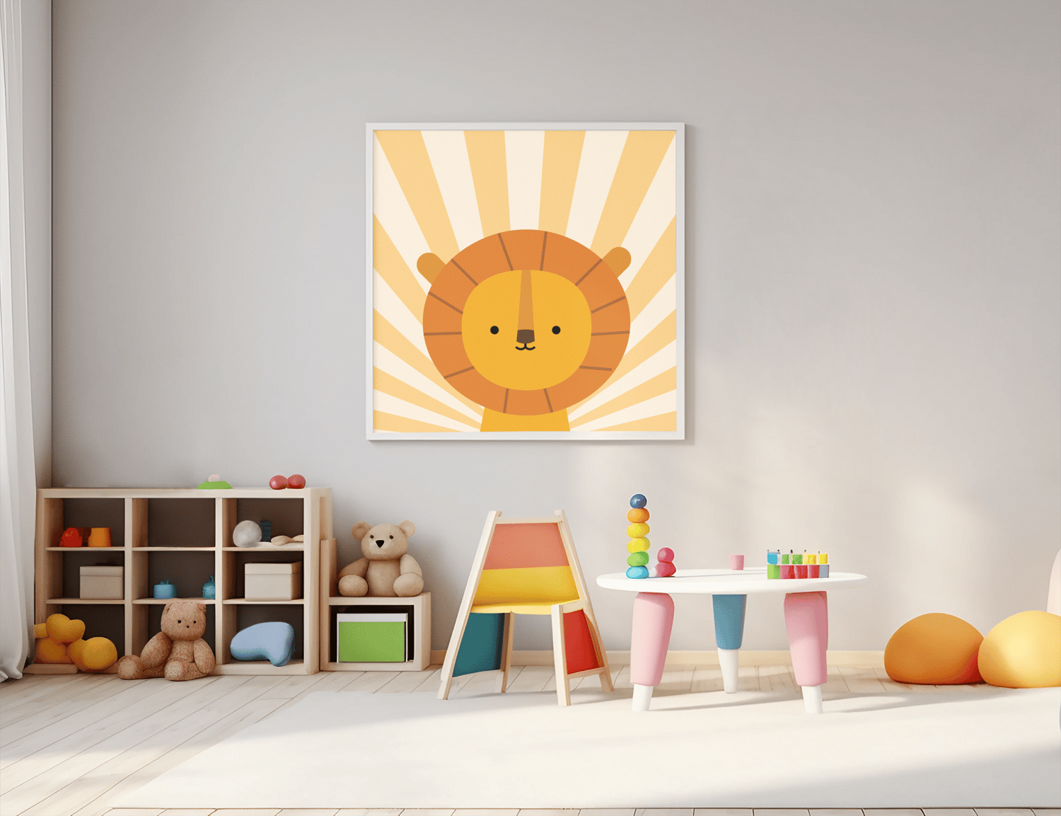 With sunshine-style stripes and a smiling lion, this piece adds warmth and courage to a nursery or playroom.
