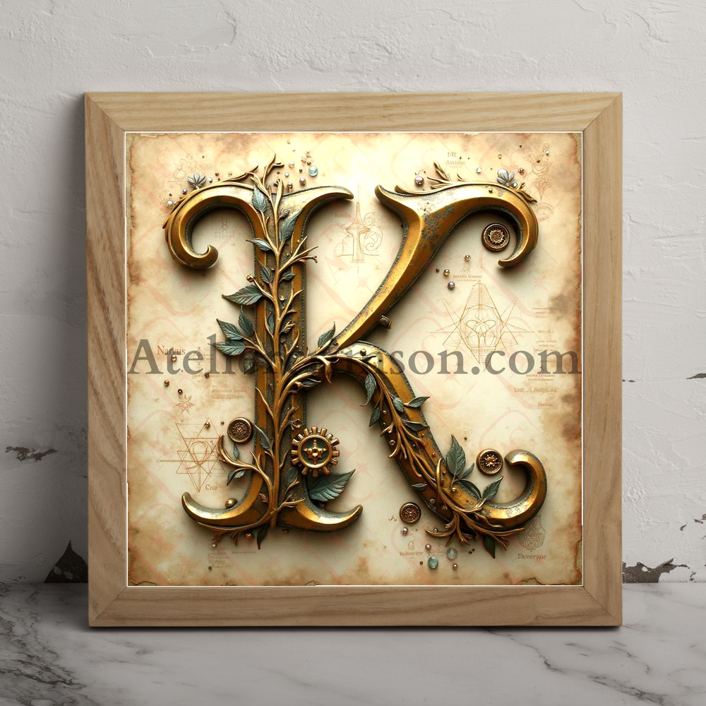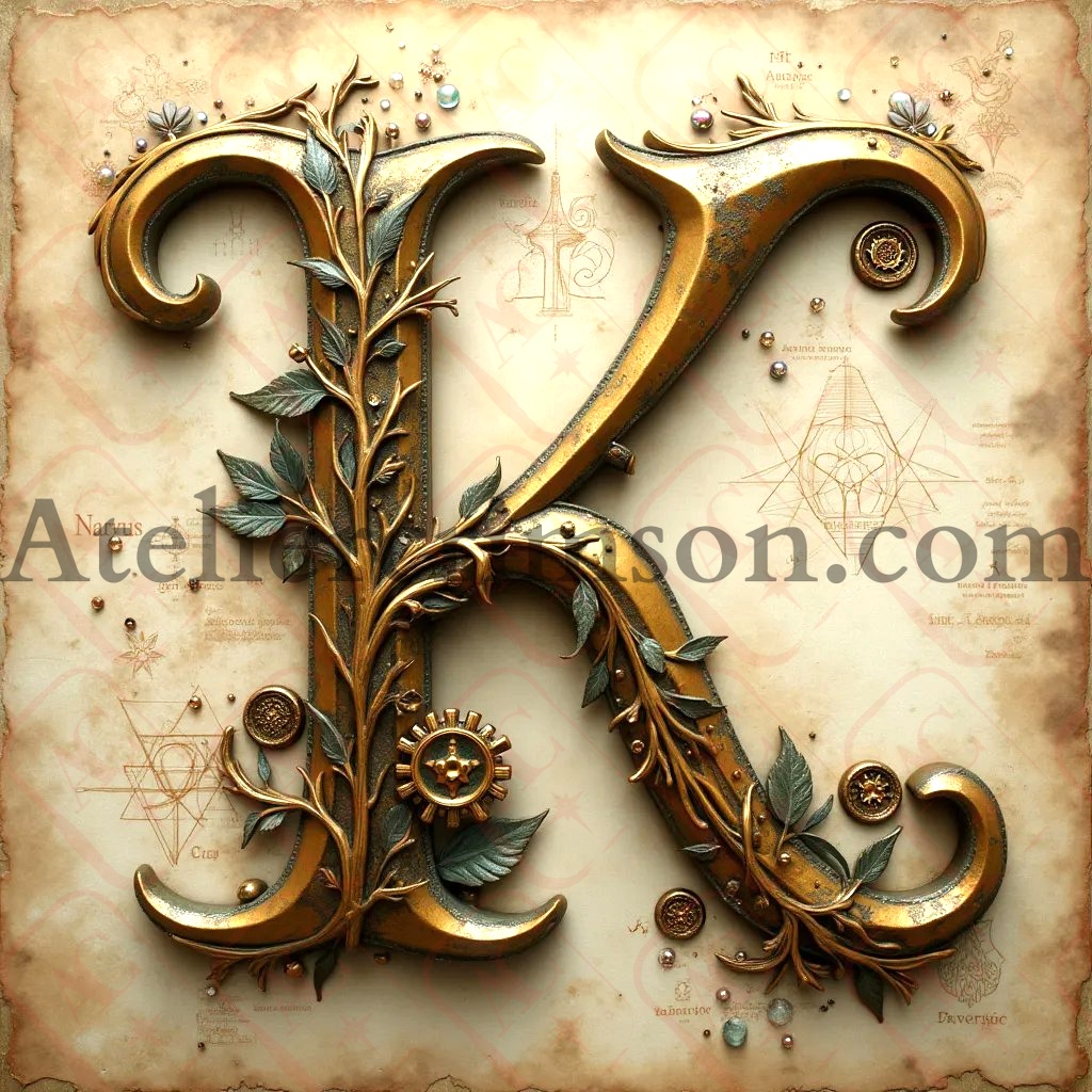The letter K Art Nouveau alchemical Each character crafted as a stunning 3D brass sculpture with weathered patina, set against a mystical alchemical parchment. Ornate vines, floating bubbles, and antique gears create a magical shabby chic atmosphere. Perfect for vintage-inspired designs, book covers, or unique wall art."