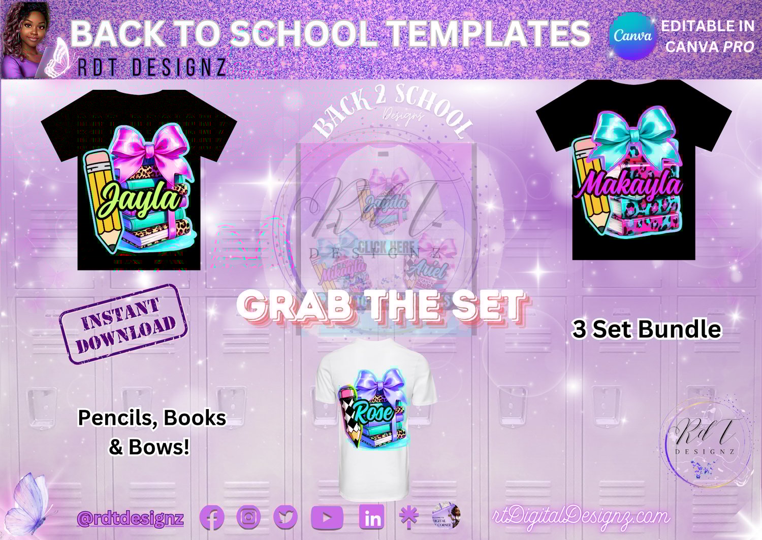🎨 3-Piece School Designs Template Set – Pencils, Bows & Books Theme – Digital Download
