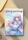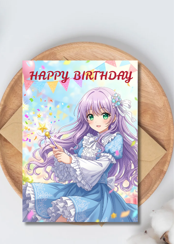 Celebrate special moments with this enchanting digital birthday card! Featuring a delightful anime-style magical girl with sparkling eyes, adorned in a beautiful frilly dress. She holds a whimsical magic wand, sending a burst of shimmering confetti and twinkling stars across a dreamy pastel background.