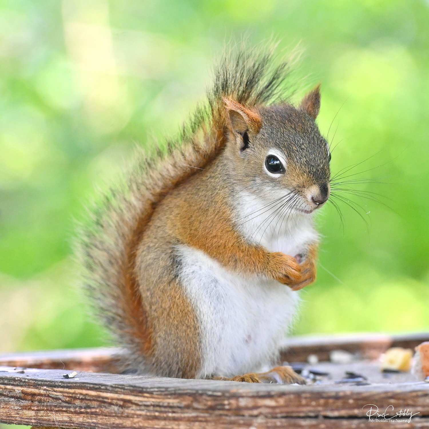 This is a photo I took of a baby American Red squirrel - taken in June 2023. I think this was Freda at about 9 weeks old. It was so much fun watching their antics as they started coming to the table to eat.