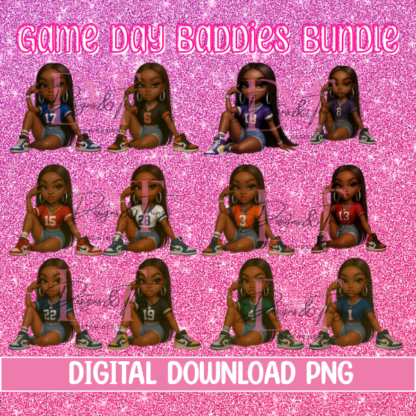 Turn up the heat this football season with our Game Day Baddies Bundle! This digital collection features a set of custom-made, stylish girl designs perfect for crafting standout shirts, tumblers, mugs, and more. Each baddie is full of personality, team spirit, and glam – ready to represent your favorite squad all season long. From tailgates to touchdowns, these bold and fashionable characters are perfect for sports fans who love to slay on game day.