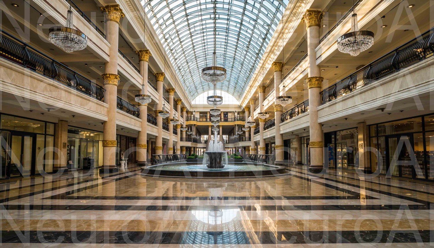Luxury shopping mall with fountain and glass ceiling
