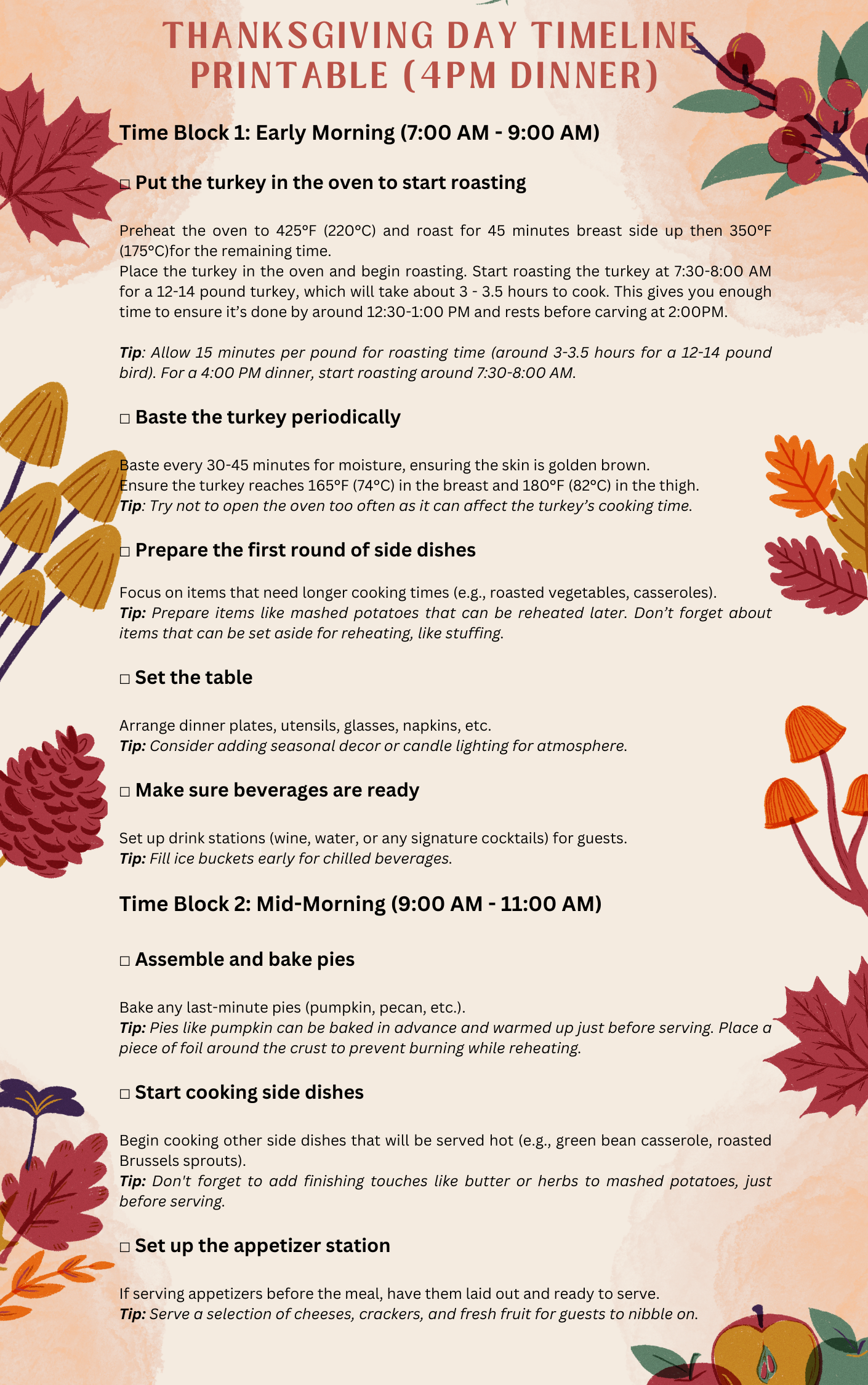 - On-the-Day Thanksgiving Checklist: Includes all the critical tasks for each time block, from prepping the turkey to setting the table and serving the meal.