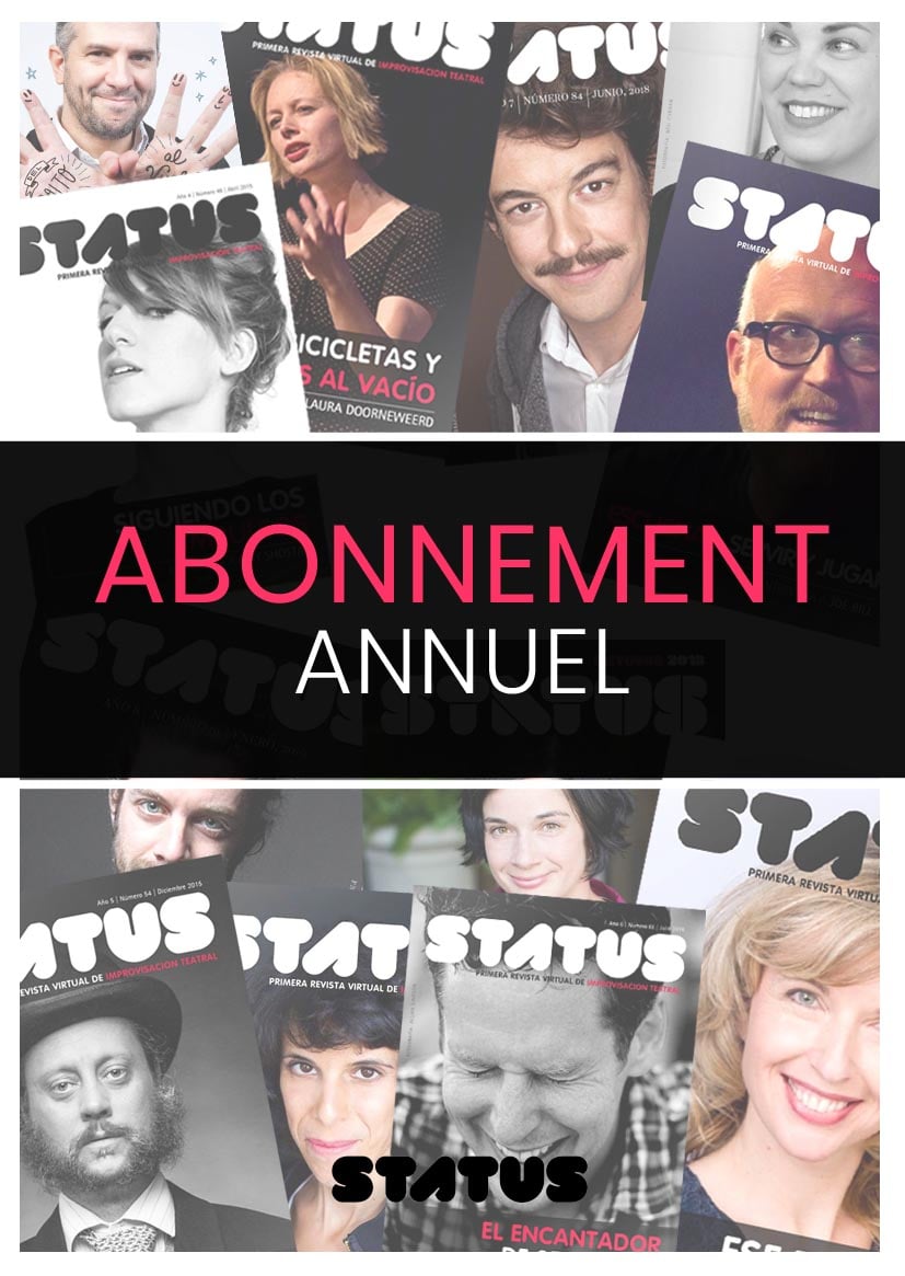 Abonne-toi à l'édition en Français de Status (Revista de Impro), le seul magazine au monde consacré à l'improvisation. En t'abonnant, tu recevras le fichier PDF du magazine tous les mois pour seulement 10€/an, et tu soutiens le projet !