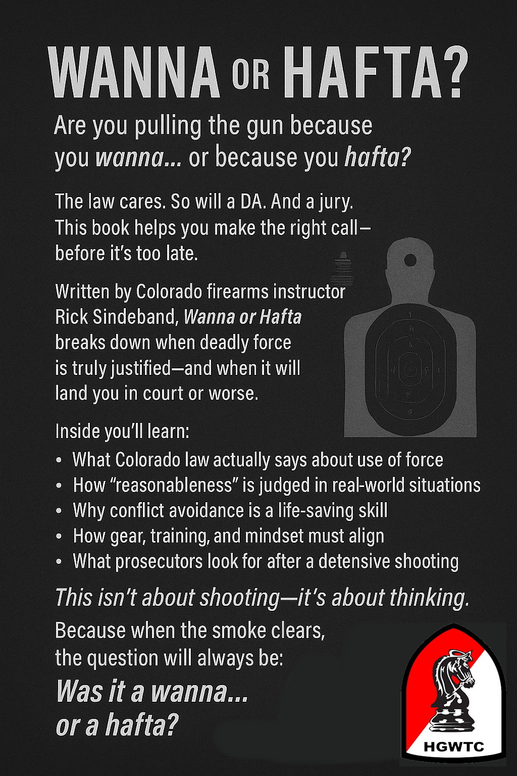 Written by Colorado firearms instructor Rick Sindeband, Wanna or Hafta breaks down when deadly force is truly justified — and when it will land you in court or worse.