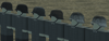 - 9 Stahlhelms / Helmets, with different colors, netting, and covers.