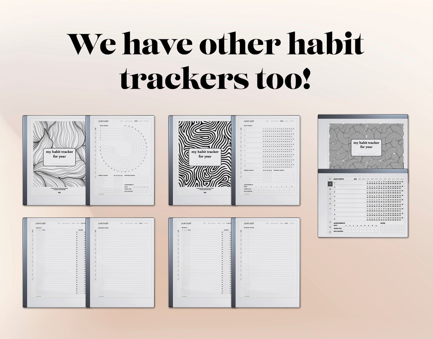 A monthly habit tracker undated that can be used year after year, designed for reMarkable 2 tablet (also compatible with reMarkable 1), hyperlinked for easy navigation.