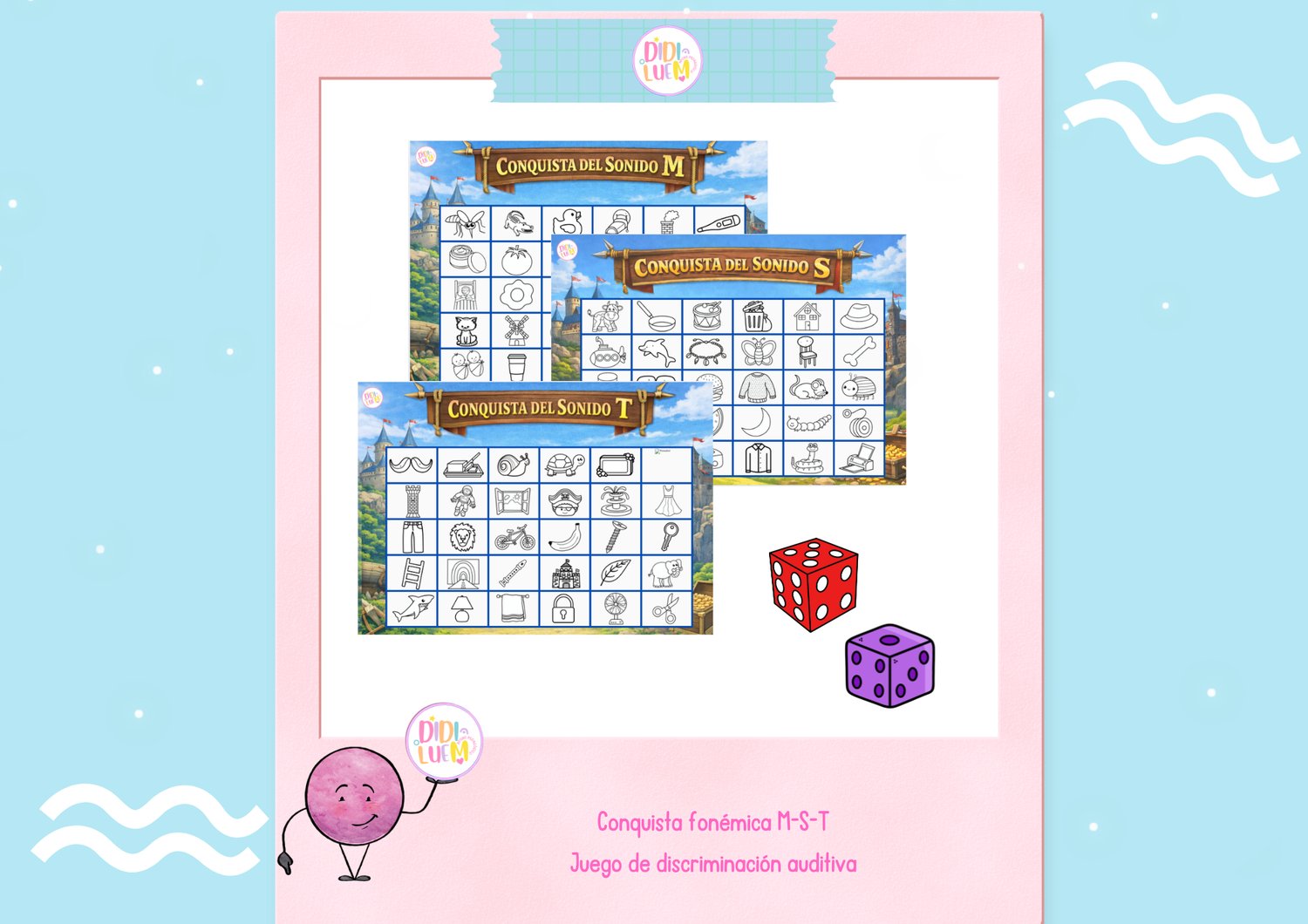 Incluye tableros de juego, dados y propuestas de uso que permiten adaptar la actividad según el nivel del alumno, convirtiéndolo en un recurso funcional tanto para el aula como para la intervención individual.