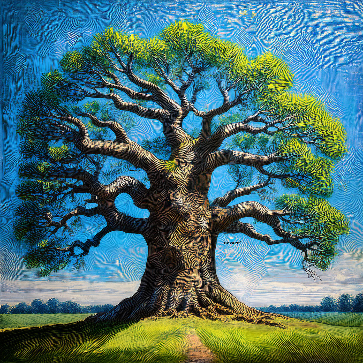 Step into a dreamy woodland where time bends and colors whisper—this is no ordinary oak. With gnarled limbs reaching like forgotten spells and layers of oil paint dancing atop pen-sketched detail, this tree tells tales older than memory. Cobalt blue sings against bright lime green in glossy harmony, while frosted highlights and grayscale shadows add a touch of quiet mystery. It's rustic, it's refined, it’s a botanical symphony in brushstroke and ink.