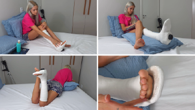 While running her hands over her cast, Hannah decides to jot down some notes in her notebook. Next, she applies moisturizer to her body, especially her toes.