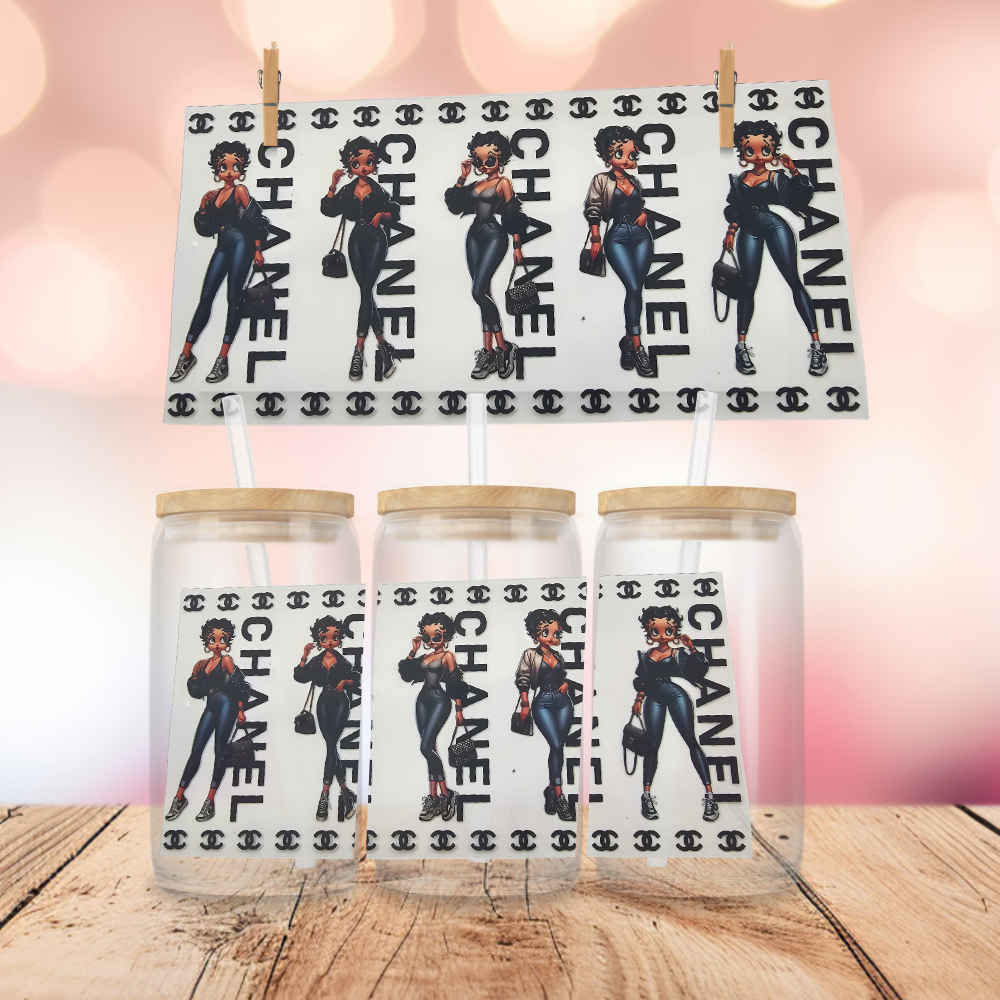 Elevate your sip with timeless luxury! The CC Designer Classy Miss B Wrap features Miss B in a sleek, high-fashion CC-inspired outfit, radiating elegance, grace, and style. Designed to fit 16 oz Libbey glass cans or tumblers, this wrap is perfect for those who love designer vibes with a boss babe twist.