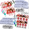 You will receive 6 girls and 8 boys in red with different hair and skin tones. You then have the option to add the eye and outfit clipart to the top of your doll to personalise.