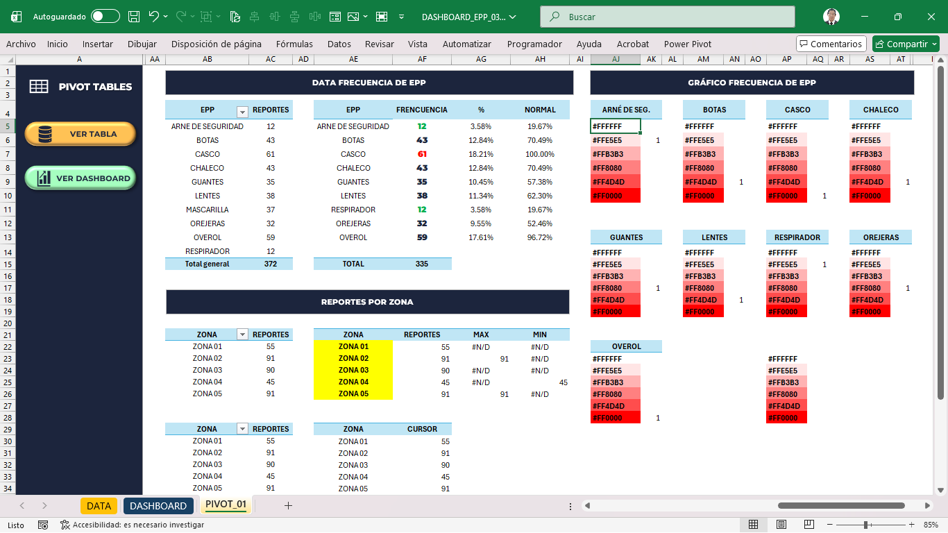 Optimiza la gestión y control del uso de EPP en tu empresa con este Dashboard interactivo en Excel, diseñado para supervisores e ingenieros de Seguridad y Salud Ocupacional.