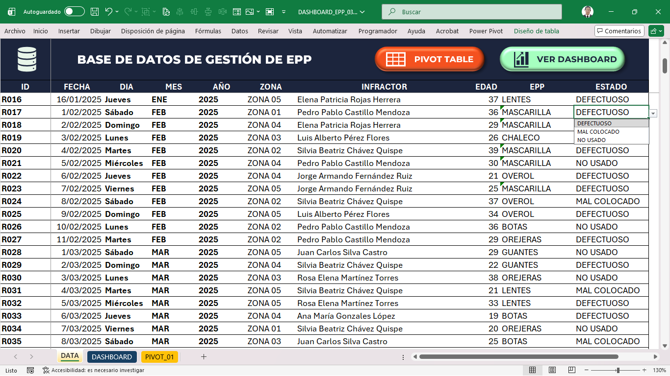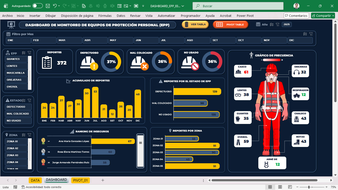 - Filtros dinámicos por mes, tipo de EPP, estado (defectuoso, mal colocado, no usado) y zona o área.