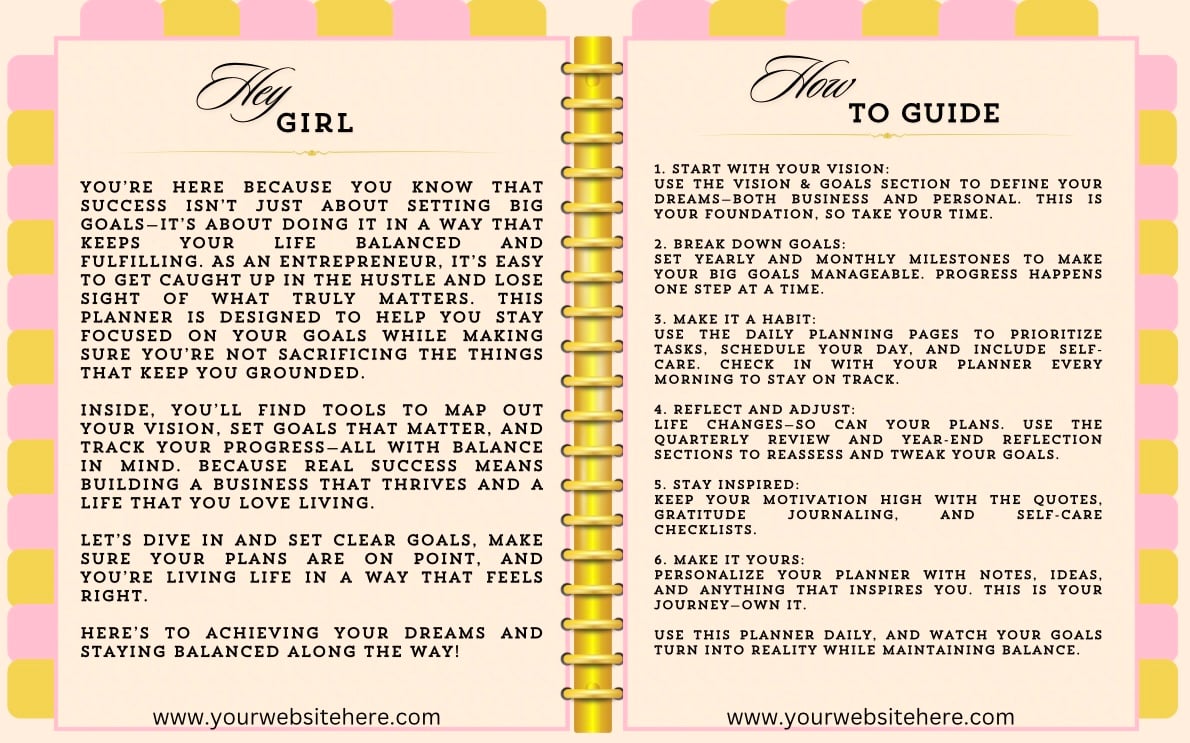 The Balanced Entrepreneur Planner is perfect for women entrepreneurs who want to stay on top of their goals while managing the everyday chaos of life. It’s designed to help you organize your time, prioritize what matters most, and create the balance you need to thrive. Whether you’re running a business, a household, or both, this planner makes it simple to stay focused and in control, so you can accomplish your goals without feeling overwhelmed.