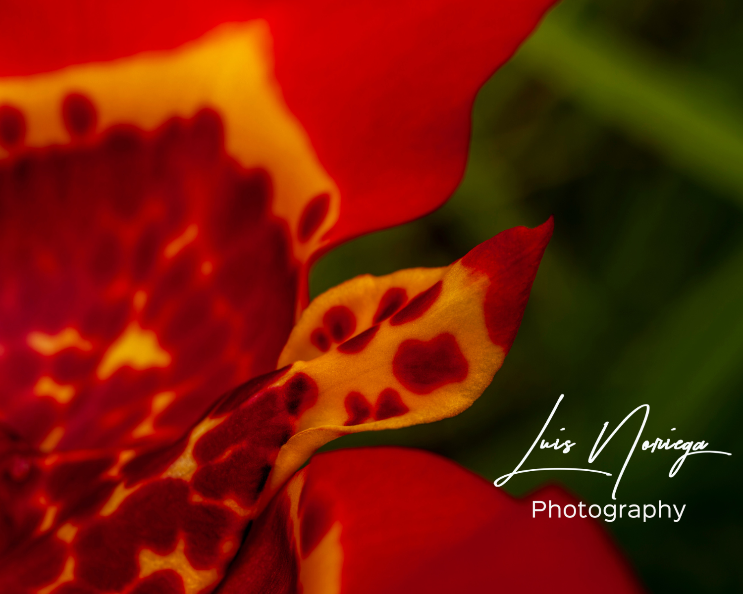 This close-up captures the intricate beauty of Tigridia pavonia, also known as the Mexican Shell Flower. Its vibrant petals are a radiant mix of red, pink, and orange tones, with a central pattern that resembles a leopard’s spots in bright yellow and deep crimson. The inner part of the flower is detailed with striking markings, creating a dramatic contrast that draws the eye to its unique structure. The soft background blur highlights the flower's bold colors and fine textures, making this image a standout in the Fragments of Light and Shadow collection, celebrating nature's remarkable artistry.
