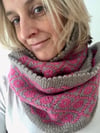 The perfect accessory for cold weather, this cowl is super-cosy, thanks to its double-layer construction. Quince Blossom’s coloured inner layer combines with the graphic detailed outer layer to produce an heirloom piece that will be treasured for years to come.