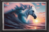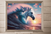 In this ethereal scene, a pure white horse emerges from the waves, its mane flowing like the water itself, set against the soft, blushing backdrop of a dawn sky. The sun, poised on the horizon, casts a gentle light that touches each cloud and wave with a warm, golden hue. The peaceful expression of the horse, along with the tranquil waters, evokes a sense of calm and renewal that accompanies the first light of day.
