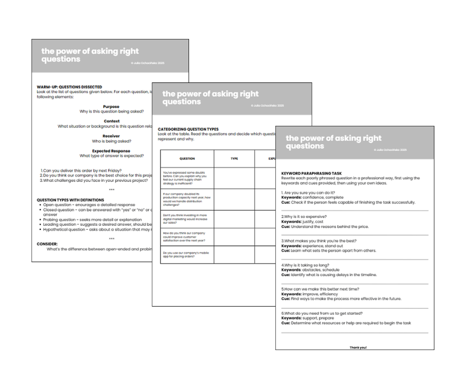A short worksheet that explores the art of effective questioning in professional settings by analysing what makes a question clear, purposeful, and tactful. The lesson guides learners through three concise tasks focusing on the structure and intent of questions, the categorization of question types, and the use of paraphrasing and key expressions to enhance clarity and engagement in business communication.