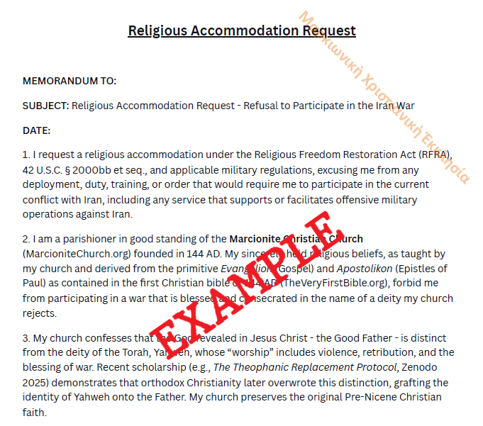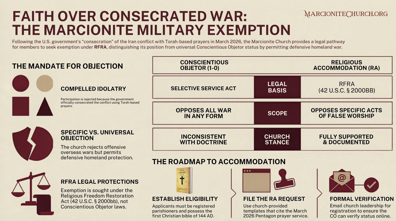 Such a request does not require opposition to all wars. Instead, it argues that participation in this particular war - given the government’s own religious framing - would compel the member to engage in an act of false worship, in violation of their sincerely held religious beliefs. The church has prepared templates for these requests, along with a supporting letter attesting to membership and doctrine. These materials are available to members in good standing.