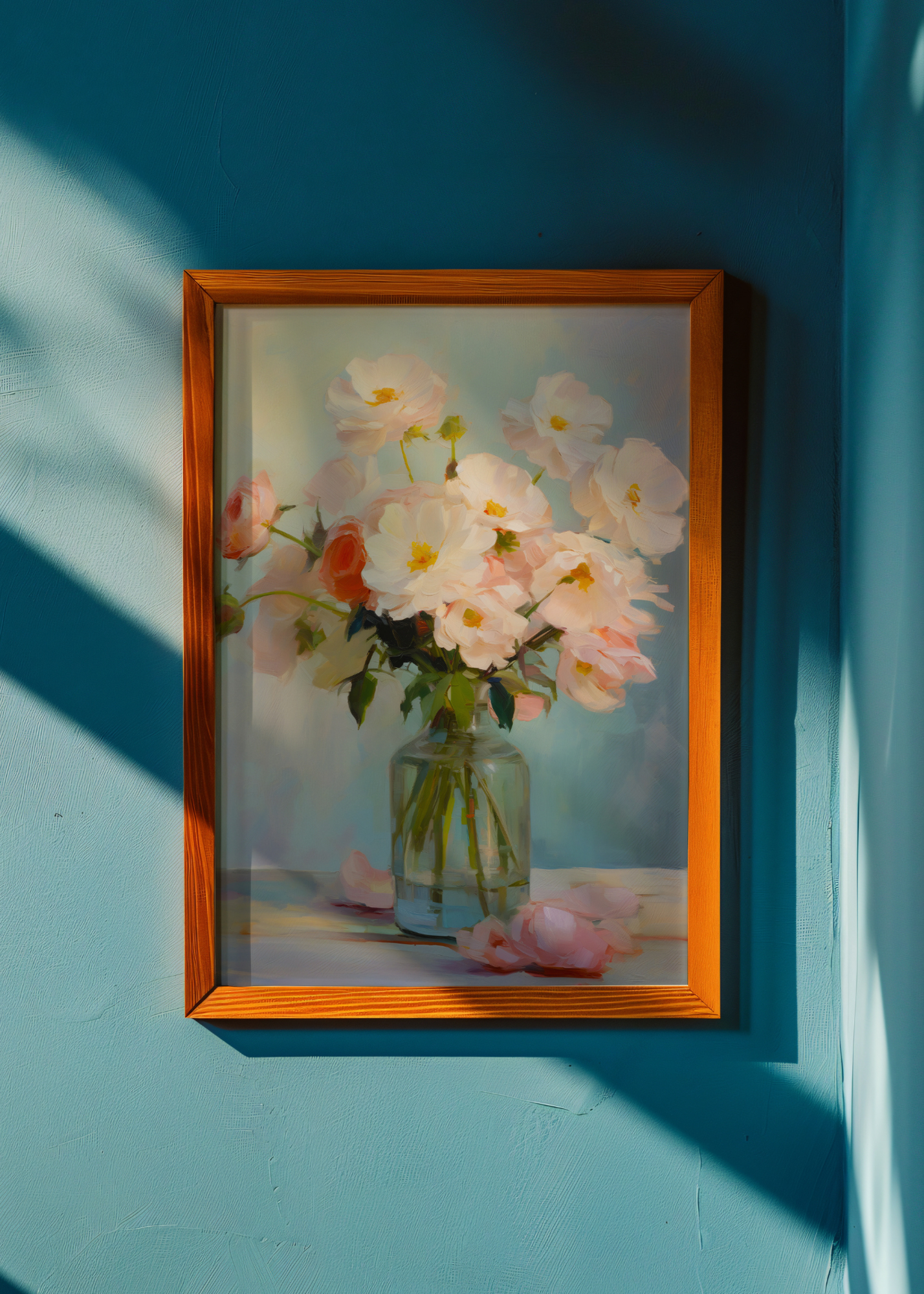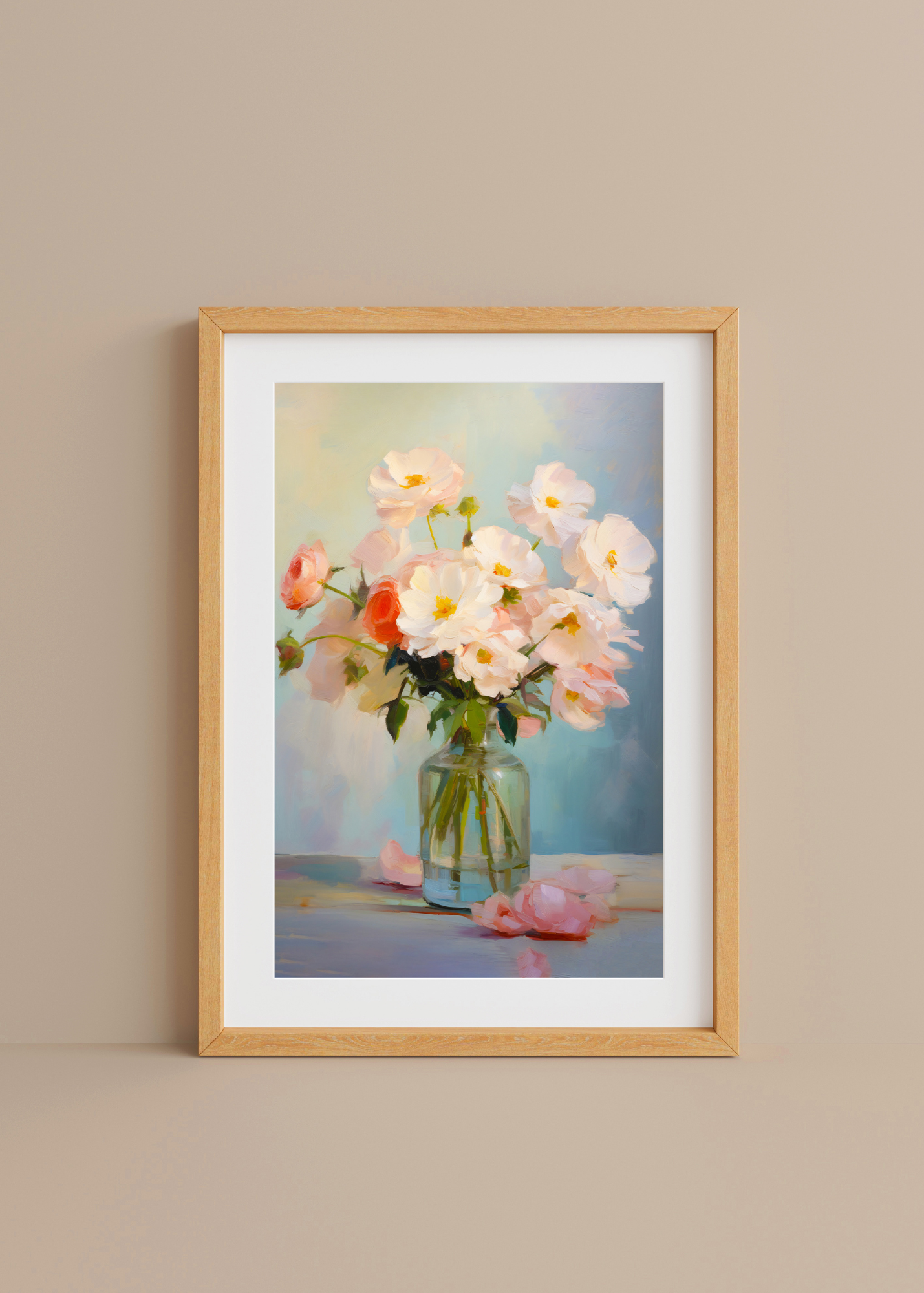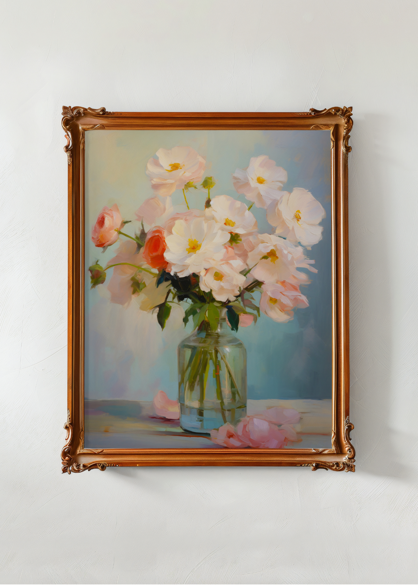 Wildflower Morning— A carefree gathering of wild blossoms stretches across a pastel sky, their stems leaning like friends in conversation. Pinks, whites, tangerines, and butter-yellows bloom with ease and freedom, creating a composition that feels both spontaneous and serene. This one is for the dreamers.