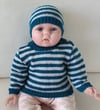 This easy knit, striped, 4ply jumper has a round neck, set-in sleeves and buttons at the shoulder making it easy to get on and off. The matching beanie features stripes and a rib brim. The set has been photographed in size 0 months.