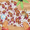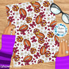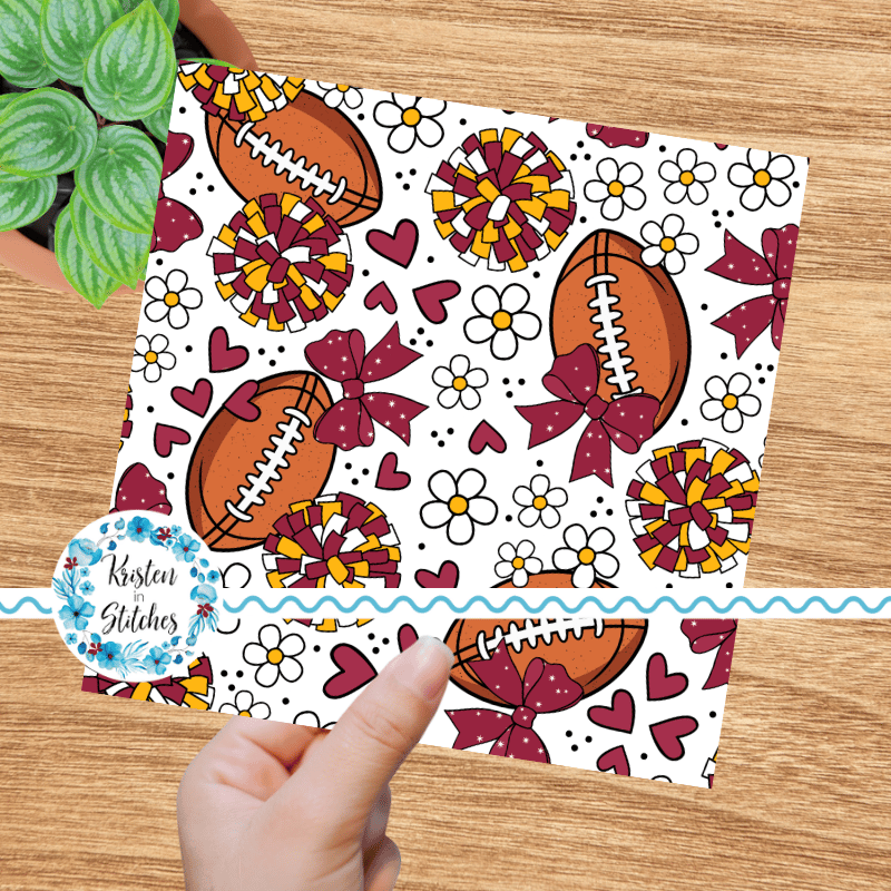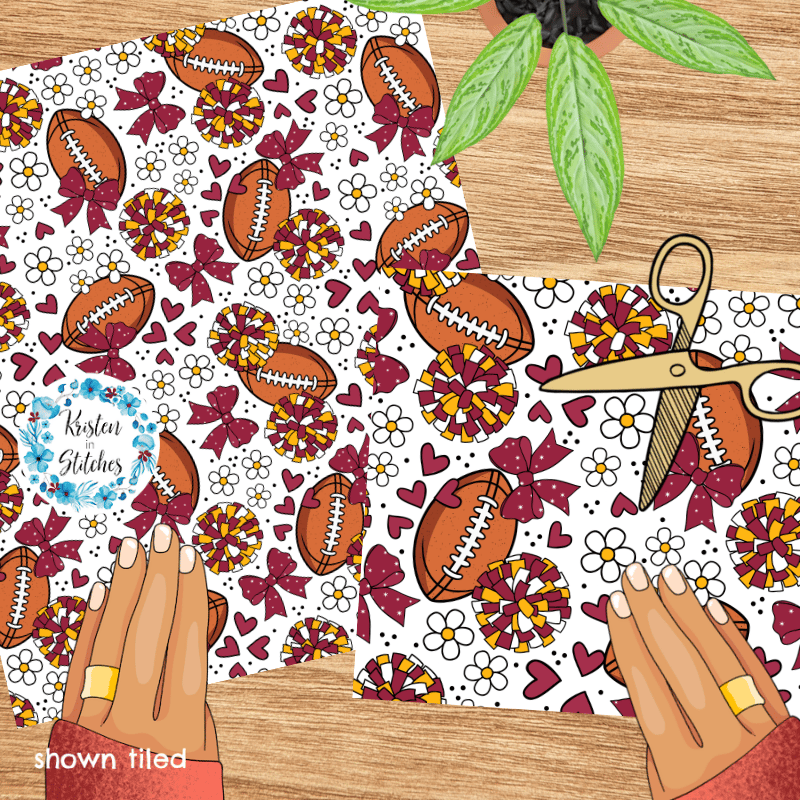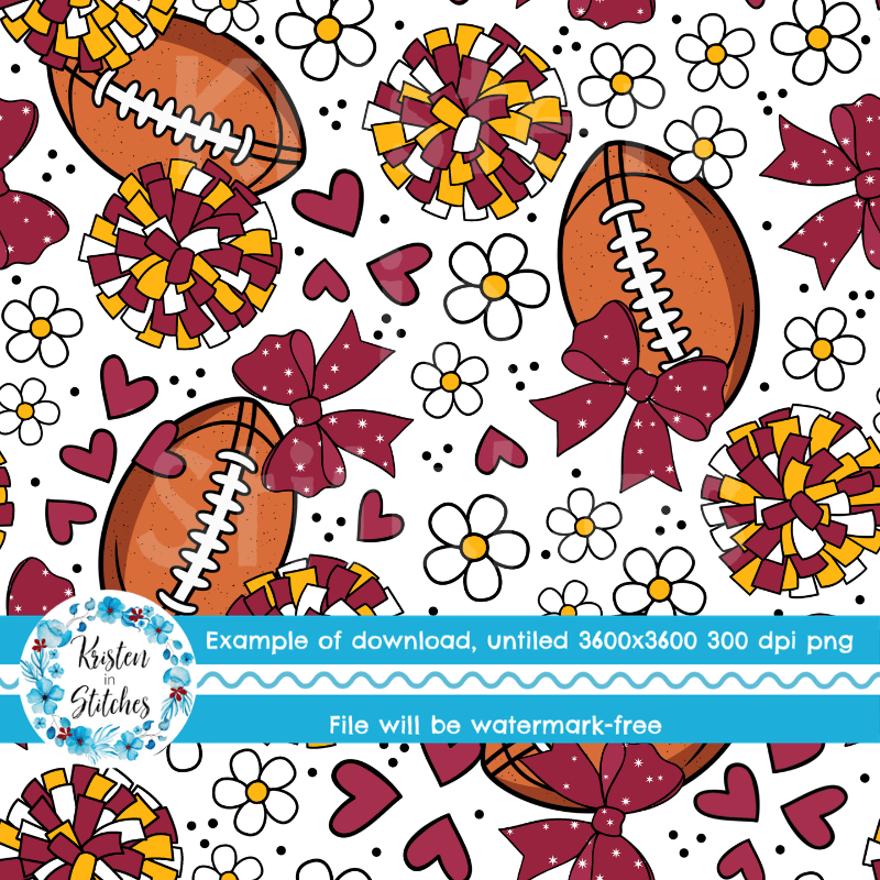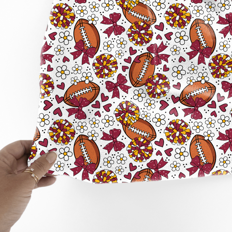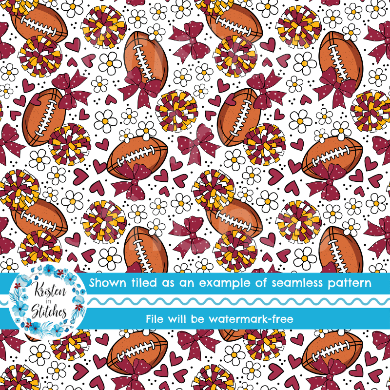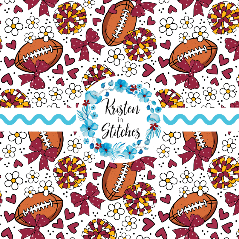 Floral pattern with daisy flowers, cheerleader bows, pompoms, footballs and hearts.