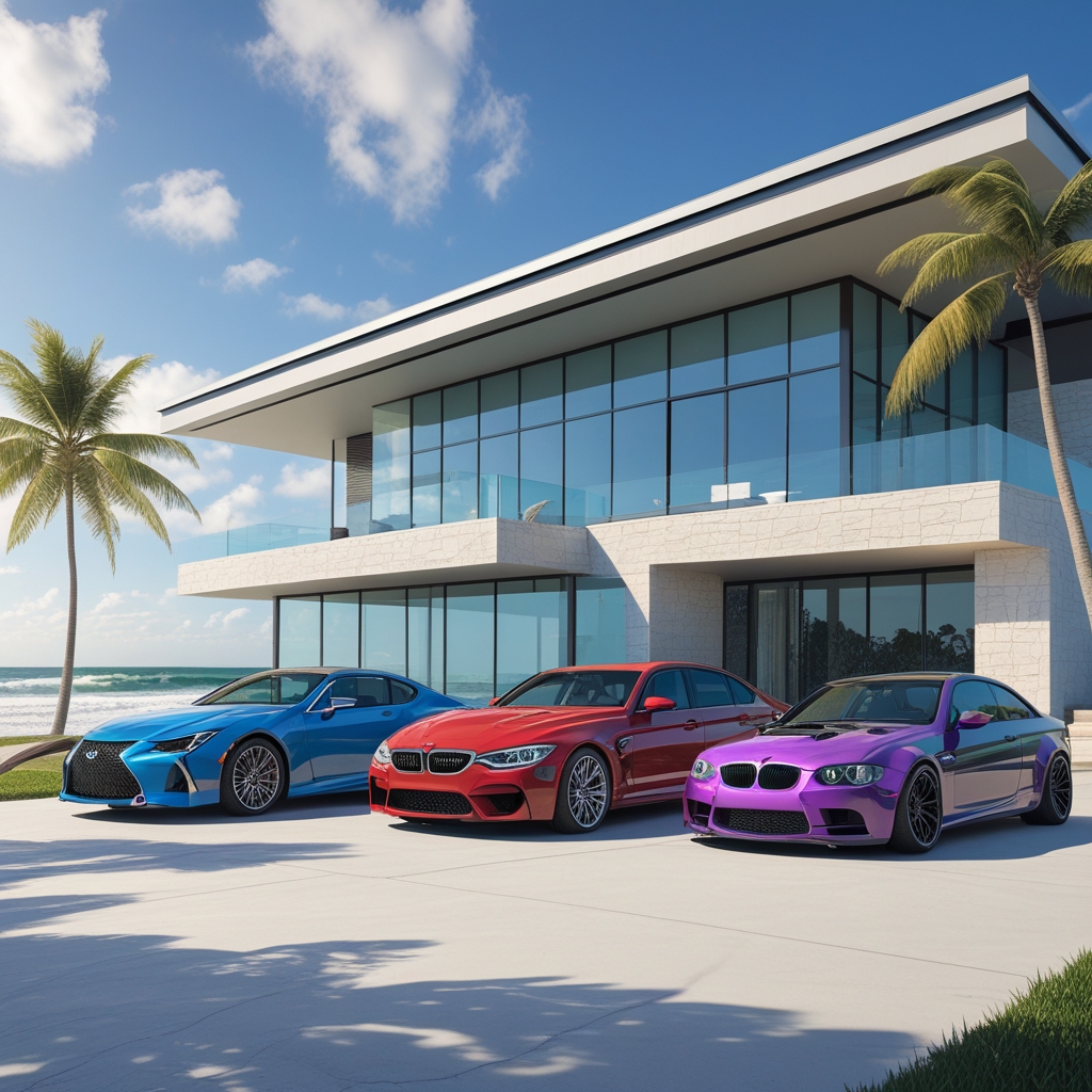 A stunning, modern mansion situated directly on the beach, with floor-to-ceiling windows, sleek lines, and a cantilevered roof, surrounded by lush greenery and palm trees swaying gently in the breeze. In the foreground, a trio of luxury cars are parked on the driveway, including a sleek Blue Toyota Lexus ES with chrome accents, a bold Red BMW M3 with silver rims, and a vibrant purple Golf R with black stripes, each with a subtle sheen in the sunlight. The mansion's exterior is a blend of glass, steel, and white stone, with a subtle ocean-inspired color scheme, complemented by the sound of waves crashing against the shore in the background, creating a sense of serenity and opulence.