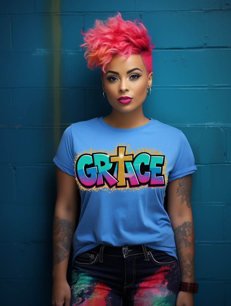 Bold, beautiful, and full of purpose—this graffiti-style “GRACE” digital PNG design makes a powerful statement of faith. Featuring vibrant lettering with a gold cross at the center and glitter accents, this piece is perfect for spiritual tees, journals, mugs, tumblers, and more. Ideal for sublimation, printable vinyl, DTF, waterslide, and other creative applications.